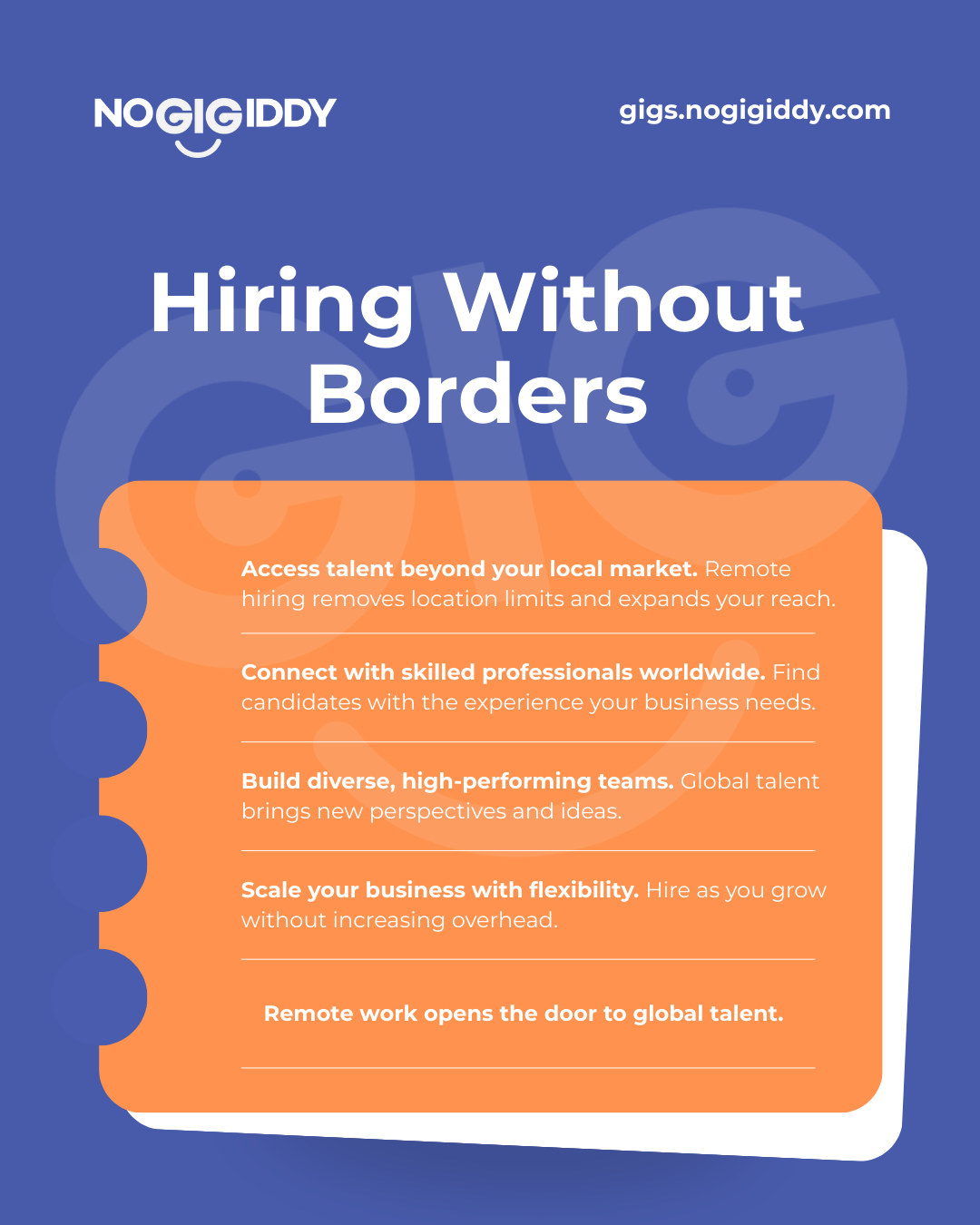 At NoGigiddy, you can connect with skilled remote professionals from around the world—individuals who are ready to contribute, collaborate, and grow with your business.